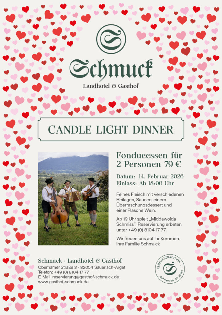 Ganz gleich, ob Sie uns eine E-Mail unter reservierung@gasthof-schmuck.de schreiben, uns unter +49 8104 17 77 anrufen oder über Instagram folgen – wir heißen Sie herzlich willkommen. Gerne stehen wir Ihnen für Fragen, Reservierungen oder persönliche Wünsche zur Verfügung und freuen uns, wenn wir Sie bald bei uns begrüßen dürfen.